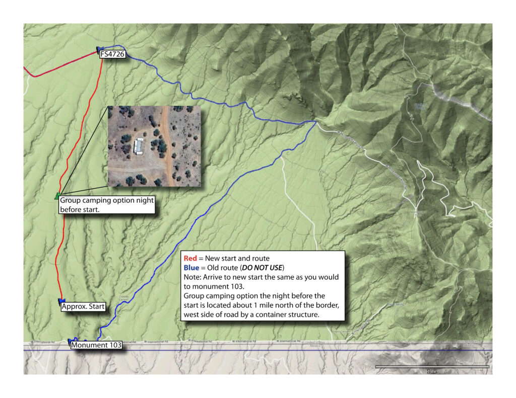 ATTN: ALL RIDERS!!! New start location and route for the first few miles of both the 300 & 800, this also affects the finish for any southbound riders. Due to the recent resumption of the border wall construction, the border road is closed to the public. The Grand Depart will begin as close as we are allowed to the Mexico border. Arrive to the starting area the same way you had planned to reach border monument 103. Nothing changes there. The route will have riders heading north of FS4726 to Montezuma Pass Rd. where they will rejoin the current route. See map below for the change, if you want to update your gpx files, they have all been updated to the GPX download page here.